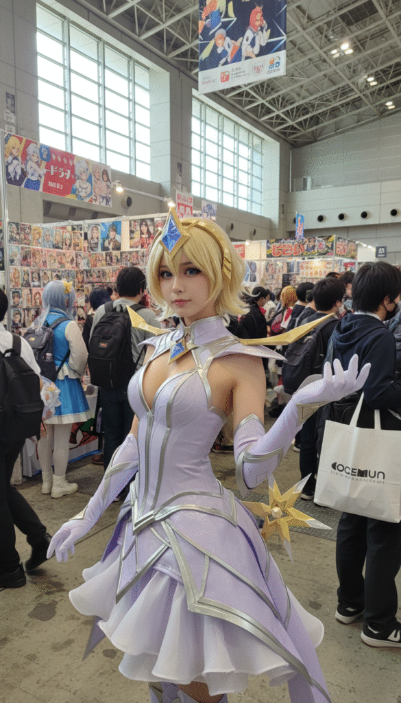 Generate a photo of a girl cosplaying this illustration, with the background set at Comiket
