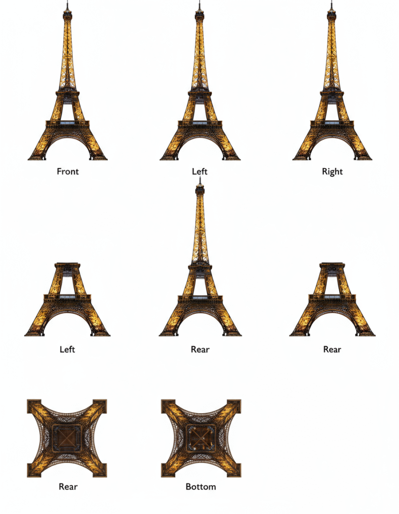 Generate the Front, Rear, Left, Right, Top, Bottom views on white. Evenly spaced. Consistent subject. Isometric Perspective Equivalence.