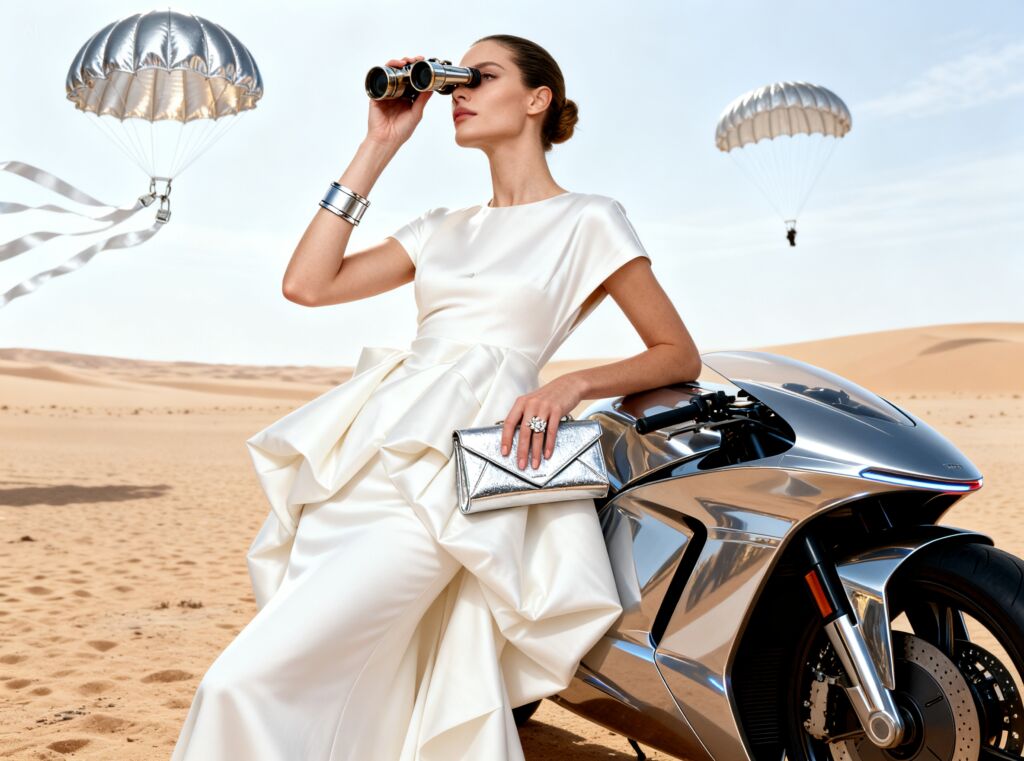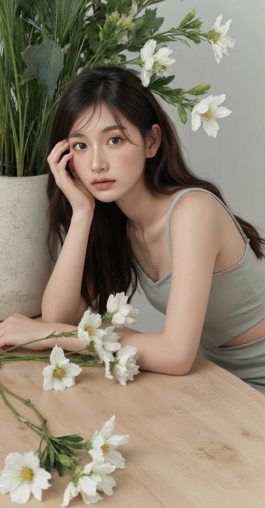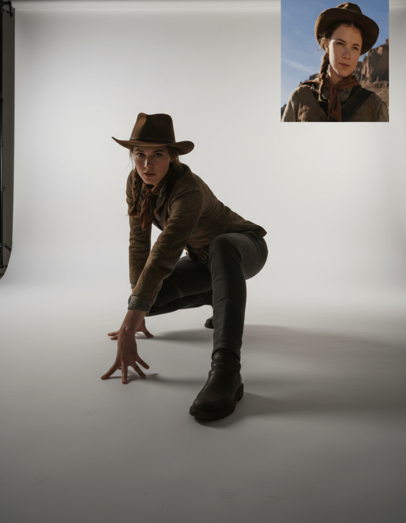 Change the pose of the person in Figure 1 to that of Figure 2, and shoot in a professional studio